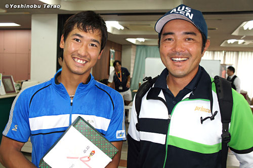 八木コーチとは昔から嫌と言うほど会場で顔を合わせているが撮った記憶がない。これ以上ない笑顔で撮れたのでトップ画像にしよう。今日は朝からかなりまとまった雨が降っていた。てっきりインドアで行われると思いミラーレスだけの軽装で出かけた。ところが会場に着いたら雨は上がり外の砂入り人工芝のコートで決勝は始まった。途中雨が降り出しかなり強くなった。レフリーの判断は続行だ。水を含んだ人工芝とボールはラリーを長引かせた。この状況は江原くん有利かと思われたが裕介が辛抱強くラリーに付き合い、フューチャーズのシングルス初優勝に繋げた。今まで1回や2回は優勝しているかと思っていた。ちなみにジュニア時代から立ち会った裕介のシングルス決勝は7回。成績は4勝3敗。今回で勝ち越した。