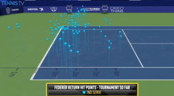 これはシンシナティのマレー戦だったか??試合中にでた2ndサーブリターンの位置です。もうほぼリサービスライン上といってもいい位置でのものが2本ありますね。