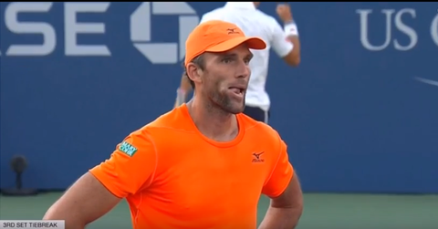 写真はカルロビッチがロブでなんとか返して、錦織がシュート回転がかかったスマッシュストロークで決めたところです。あまりに翻弄されて立ち尽くすカルロビッチ。。。印象的なシーンでした。(動画UPしてます)