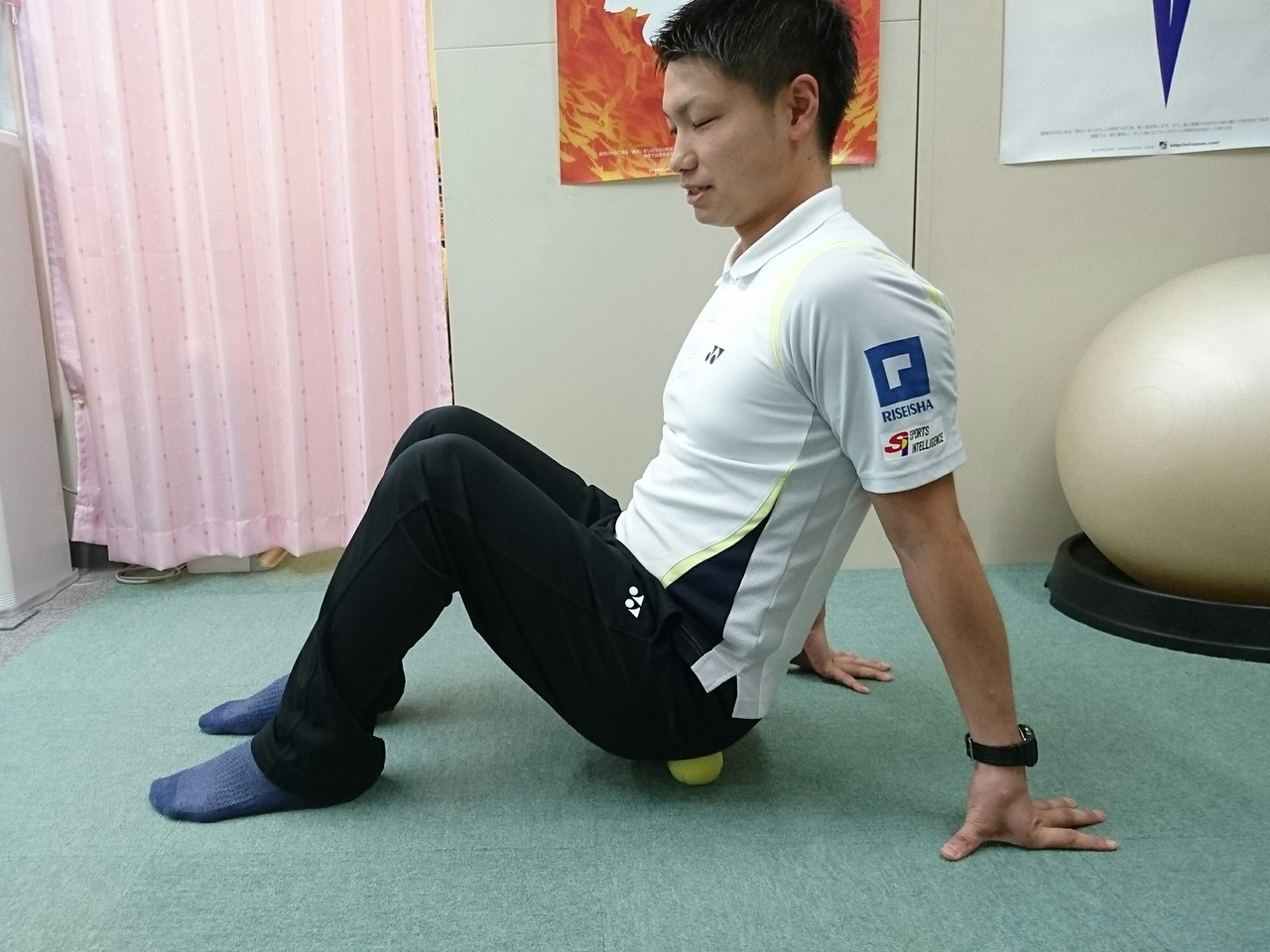 ボールでのほぐしは、特に時間設定はありませんが、臀部全体で4分~5分程度を目安に行いましょう。