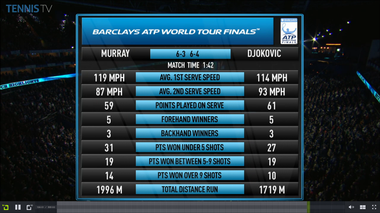 1位を賭けた決勝でしたが、マレーのエラーは少なく、よく走りましたね!!返されるのがプレッシャーとなりジョコビッチがありえないようなスマッシュミスやボレーミスをしていまいた。
