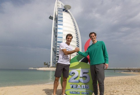 ドバイ選手権のプロモーションとして、フェデラーとマレーがブルジュアアルアラブの前でビーチテニスをしています!ドバイは25周年記念になります。