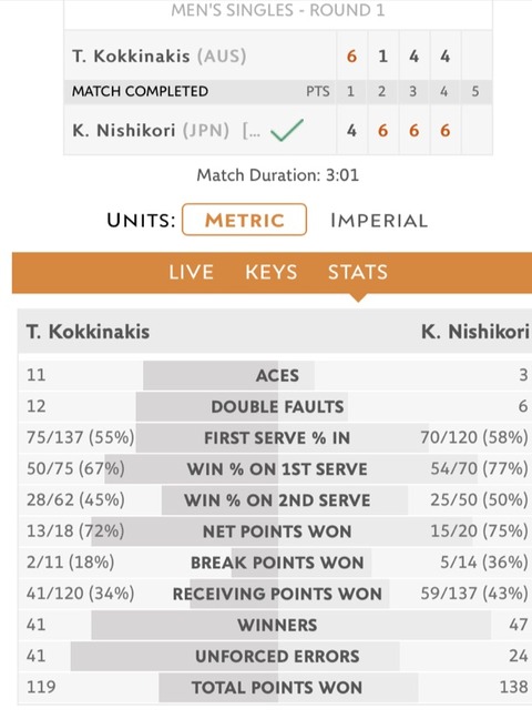 2017 French Open (Grand Slam) 1st Round Kei Nishikori[8] def. Thanasi Kokkinakis, 4-6,6-1,6-4,6-4 コキナキスは元々、キリ […]