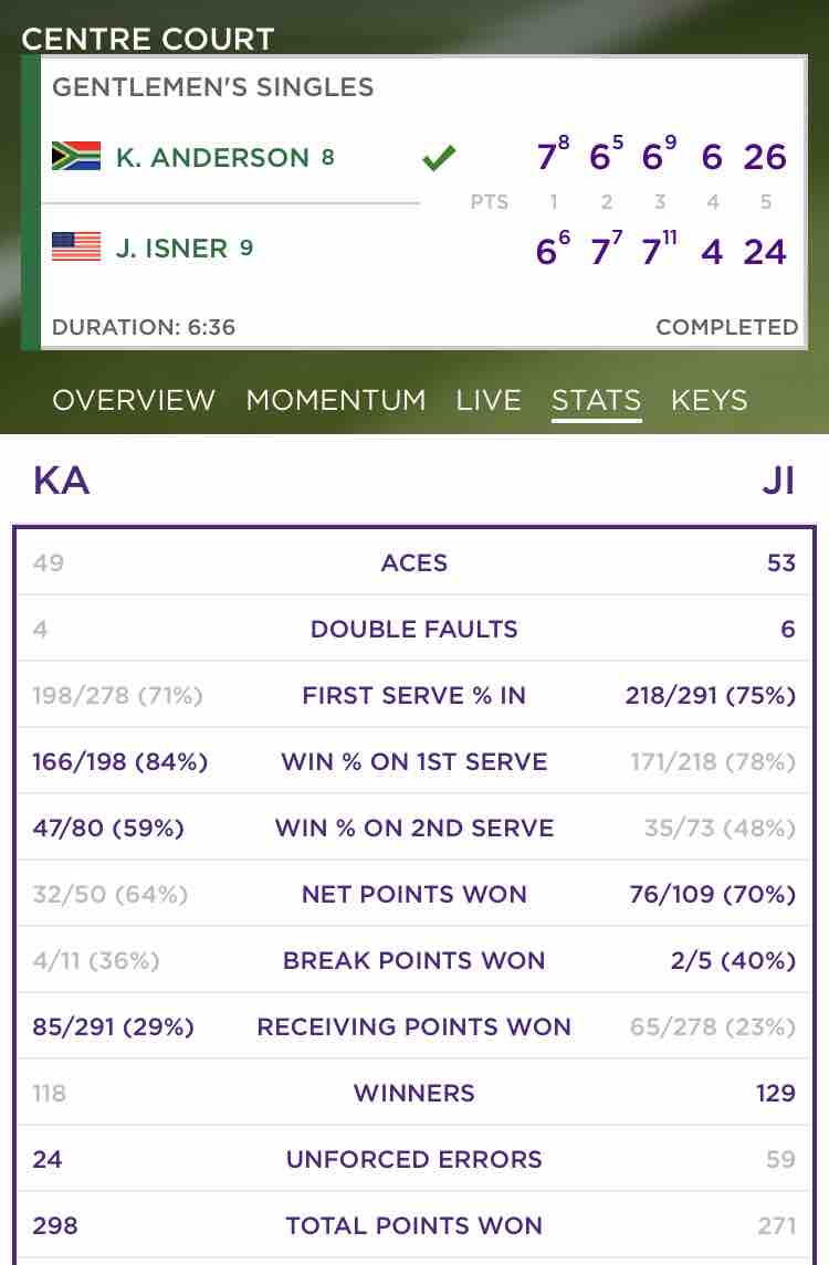 アンダーソンがイズナーに7-6 6-7 6-7 6-4 26-24で勝利しました!