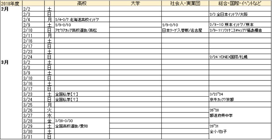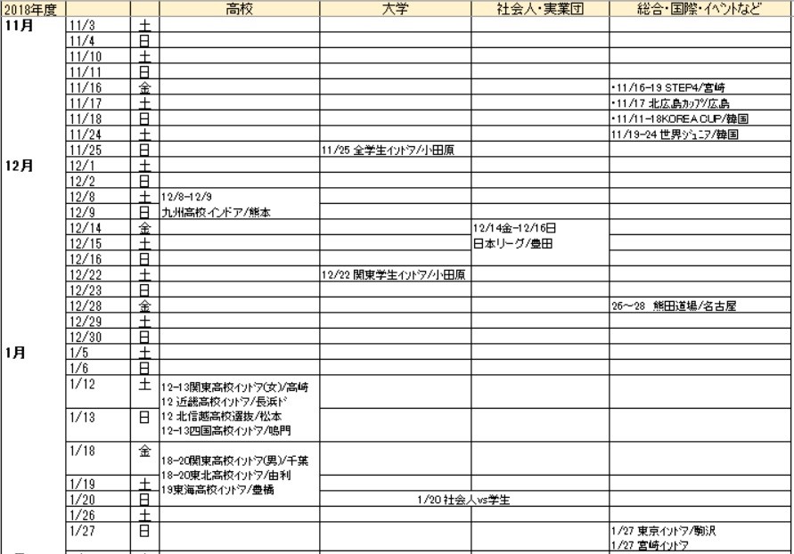 2018年11月~2019年3月までの主要大会やイベントのスケジュールを整理してみました!