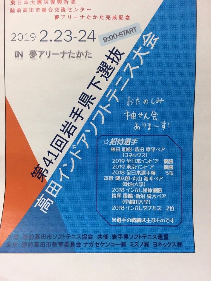 第41回岩手県下選抜高田インドアソフトテニス大会が夢アリーナたかたにて開催されます。