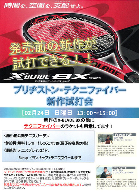ブリヂストン・テクニファイバーの新作ラケット試打会のお知らせです。 日時 2月24日(日曜日) 13:00~15:00 場所 勘兵衛テニスガーデン(当店から徒歩3分) 参加費 無料! 定員 20名予定 発売前のモデルをじっくり試打できます。 お申し込みは、当店までメールにてお願いいたします。 ★人気blogランキング参加中★読んだ後は一日一回応援のワンクリックをお願いします。