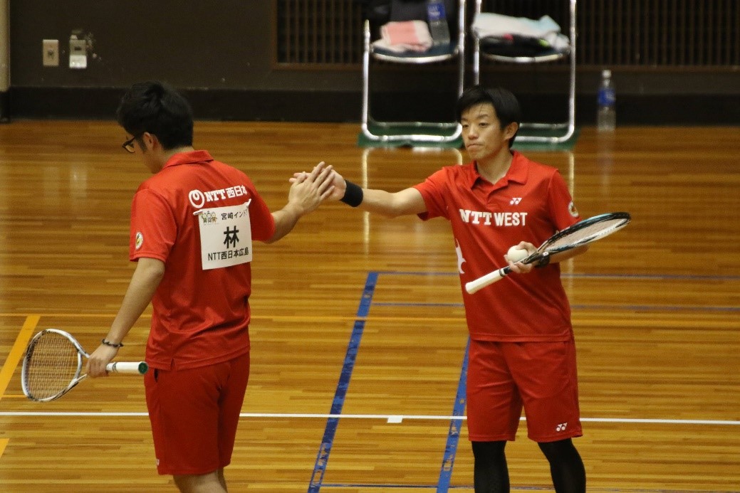 積極的に前にでて迫力のあるプレーの鹿島・井口組に対し、雁行陣で丁寧にゲームを進める長尾・松本組。ゲームは拮抗しG2-2とシーソーゲームとなる。勝負にアクセントを加えた第六ゲーム長いデュースを鹿島・井口組が5-⑦で制するとさらにゲームの展開は迫力あるものになる。鹿島・井口組がP2-3としマッチを握るもデュースに。先に井口選手がポーチを決め、再びマッチポイントを握ると最後は長尾選手のパッシングがネットにかかりゲームセット。鹿島・井口組の優勝が地元宮崎の会場を歓喜の渦に巻き込んだ。