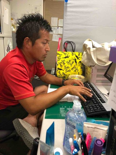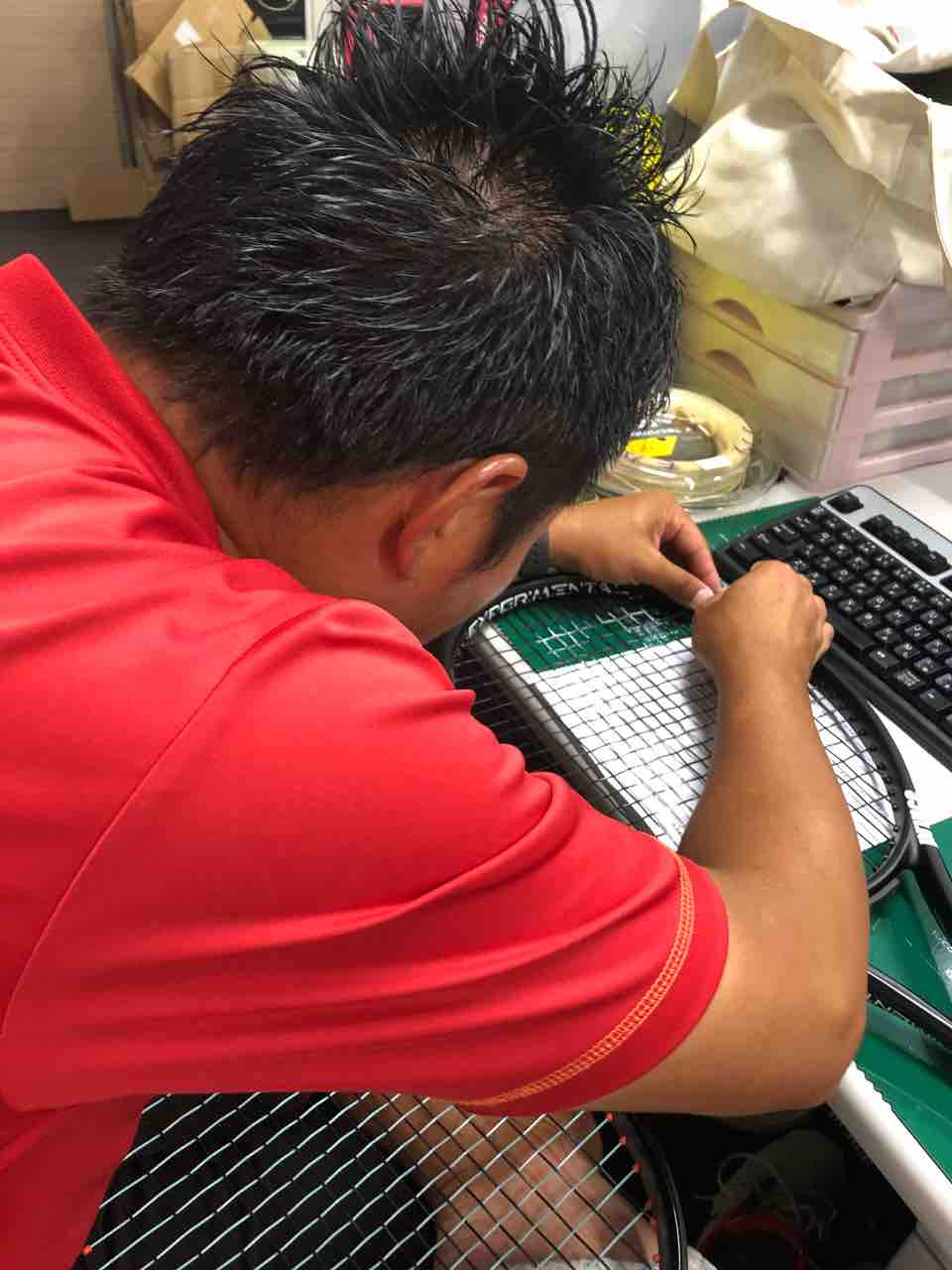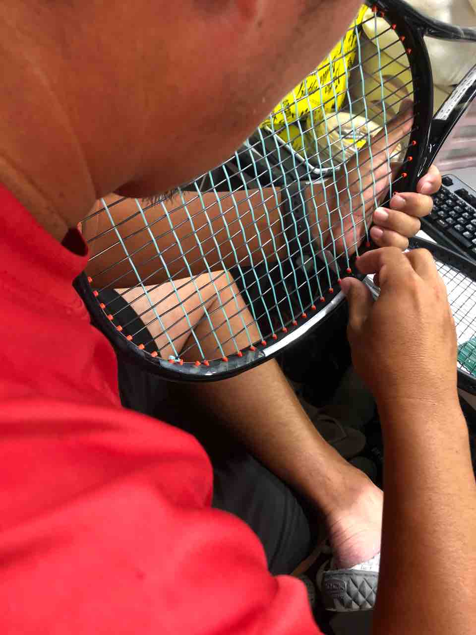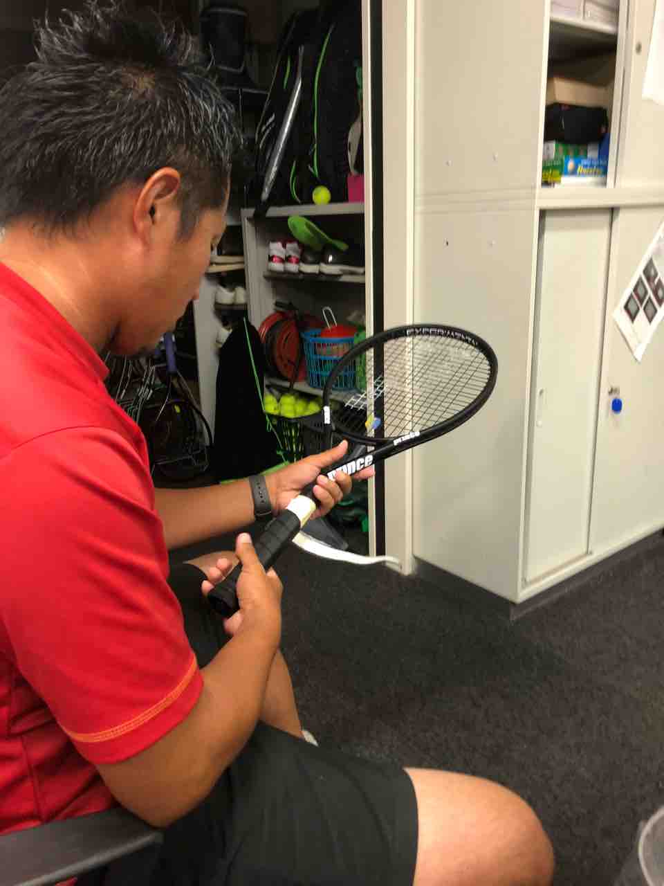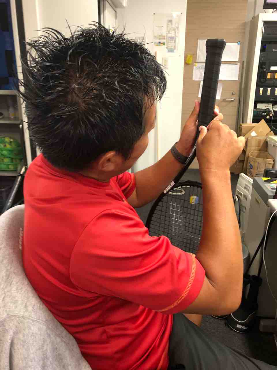 ラケットの元グリップを剥がしてテープやらなんやらを貼ってる姿、ちょこっとの重りを貼ってる姿や、