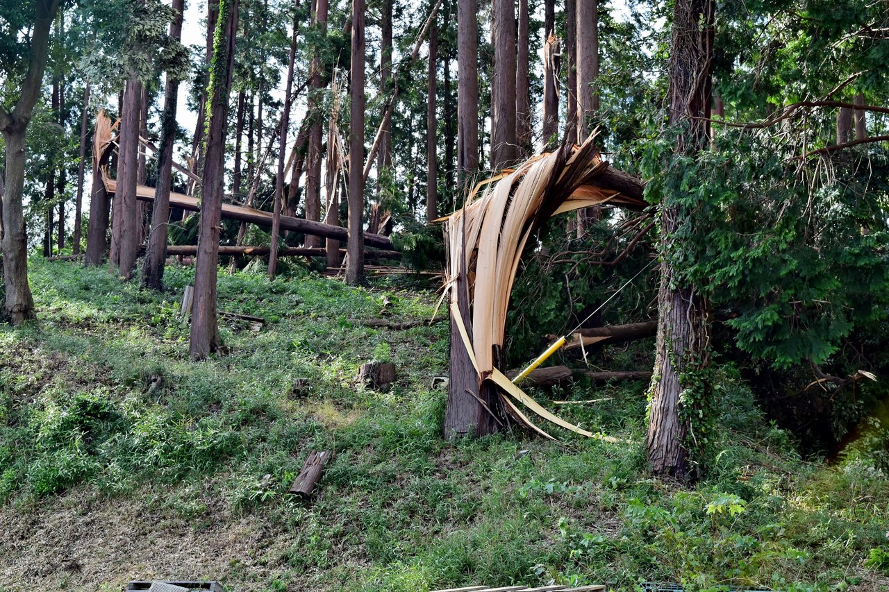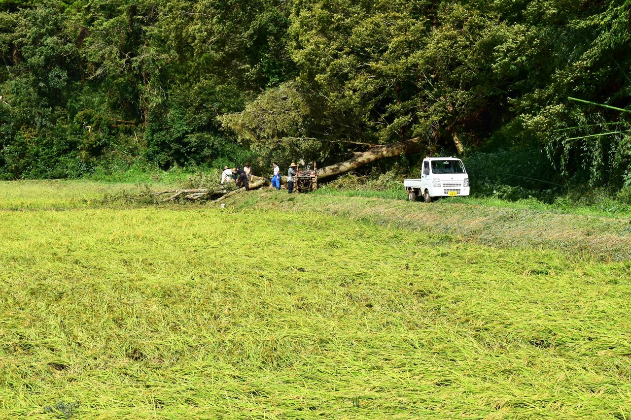 農道が倒れた大木に塞がれ