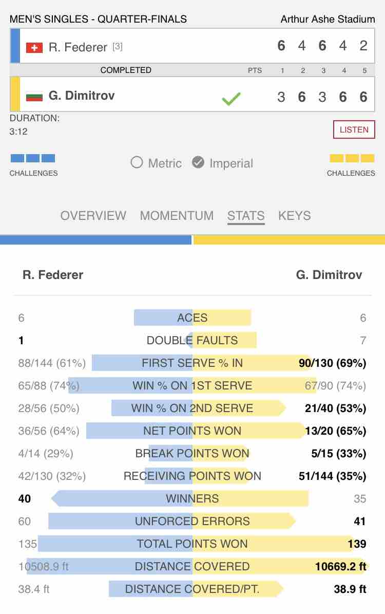 ディミトロフは今日の試合に全てを賭けるっていうぐらいの気持ち感じました。体が動いてましたし、リターンやフェデラーのボレーに対する反応が素晴らしかった。また、ネットに出るタイミングの良さを感じました。少し浮くと素早くネットとるあたりは、フェデラーのタイミングにも近い(フェデラーは結構、無理してネット出るのが今日は多かったですが…)。