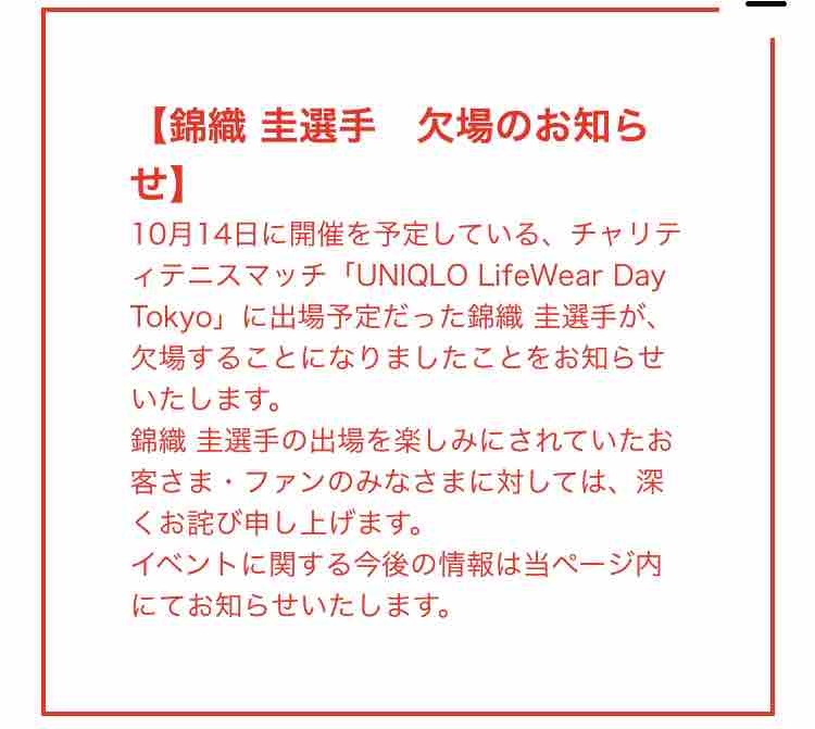 錦織「いいニュースと悪いニュースがあります。多くの方が知っている通り全仏から悩まされてきた肘と腕の状態について、ここ数日医療チームとじっくり確認しました。いいニュースは、回復に大きな進展があり、ようやく痛みが取れてきました。体の構造的には腕と肘には問題ないようです。悪いニュースは、まだ100%ではなく、未だに腫れがあり水がたまっており、医師によるとテニスが出来るまでもう3~4週間かかるとのこと。このアドバイスに従うことが、腕と肘の違和感を取り、腫れと水がなくなるためには重要です。1日3~4時間ボールを繰り返し打っていては、腕は完全に癒えません。アジアン・スウィングは楽しみにしている時間の一つであり残念ですが、楽天オープン、上海マスターズ、ユニクロエキシビションではプレー出来ません。もっと強くなって戻ってこれるよう頑張ります。サポート有り難うございます。進捗はまた報告します。」