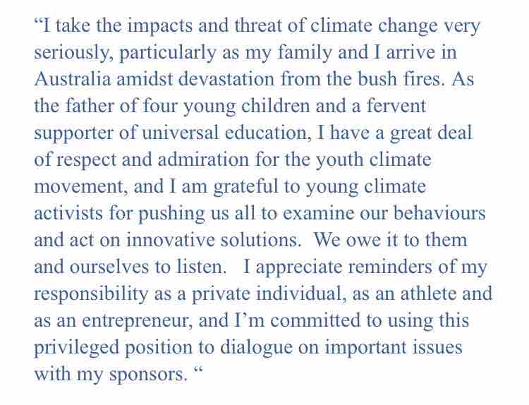 「私は気候変動の影響と脅威を深刻に受け止めています。特に私の家族と山火事で荒廃するオーストラリアに到着するときはそのことを考えさせられます。私は4人の幼い子どもの父であり、普遍的な教育の熱烈な支持者であり、若者の気候変動運動に多大な敬意と賞賛を抱いています。私たちは彼らと自分自身に耳を傾ける義務があります。個人として、アスリートとして、そして起業家としての私の責任を思い出させてくれます。恵まれた立場を生かして、重要な問題についてスポンサーと対話していきます。」