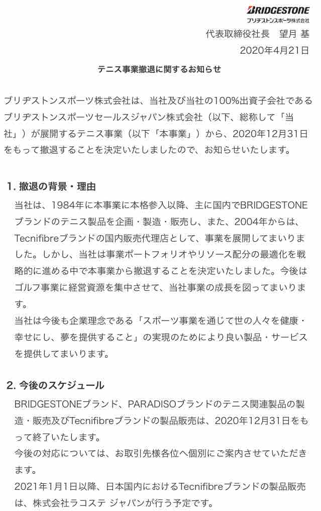ブリジストンが2020.12.31をもってテニス事業から撤退するとのことです。今後はゴルフに集中していくそうです。
