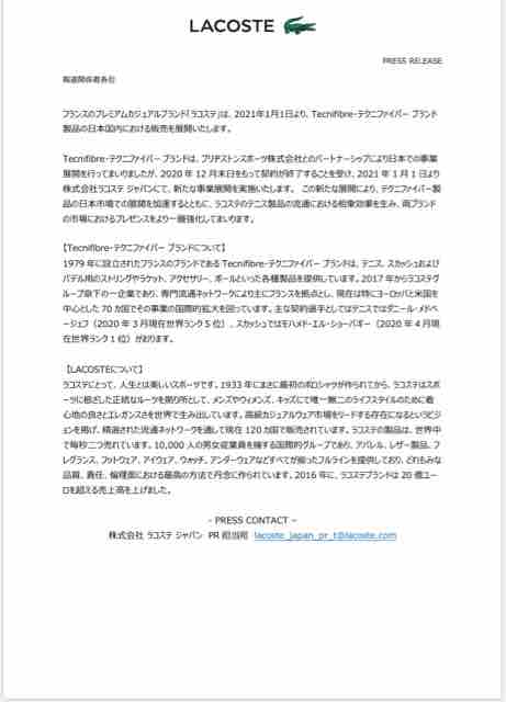 Tecnifibre・テクニファイバー ブランドは、ブリヂストンスポーツ株式会社とのパートナーシップにより日本での事業展開を行ってまいりましたが、2020年12月末日をもって契約が終了することを受け、2021年1月1日より株式会社ラコステ ジャパンにて、新たな事業展開を実施いたします。 この新たな展開により、テクニファイバー製品の日本市場での展開を加速するとともに、ラコステのテニス製品の流通における相乗効果を生み、両ブランドの市場におけるプレゼンスをより一層強化してまいります。