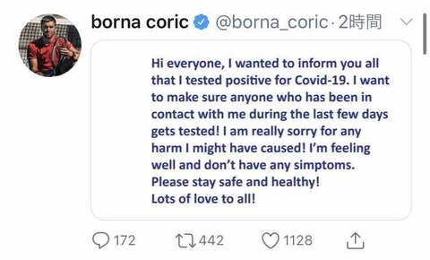 チョリッチ「新型コロナウイルスの陽性反応が出たことを伝えたいと思います。この数日間で私と接触した人が必ず検査を受けてもらいたい。ご迷惑をおかけし、申し訳ありません。体調はいいですし、症状も出ていません。(皆さん)安全で健康でいてください」
