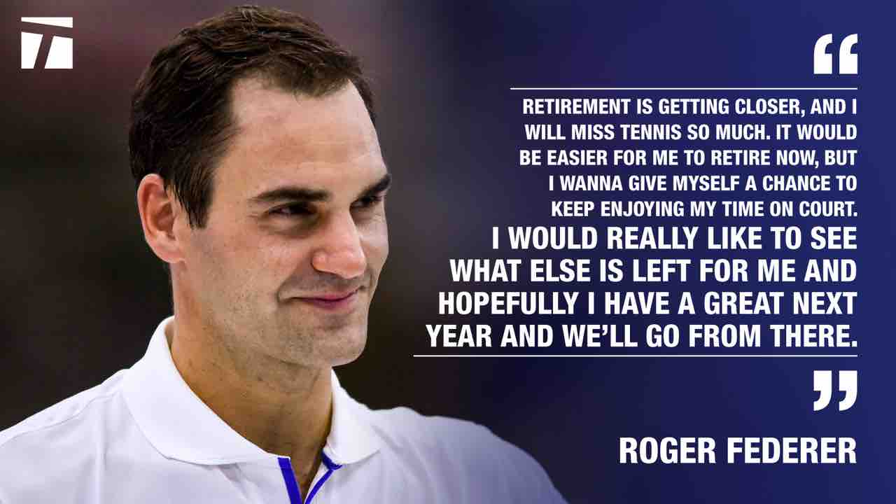 フェデラー「引退が近づいてきている。テニスの試合が恋しいよ。今、引退すれば楽になれるかもしれない。しかし、テニスを楽しむチャンスを自分に与え続けたい。他にあと何ができるのか本当に知りたい。希望的観測になるが、来年は素晴らしい年にするために私達はそこへ向かいます。」