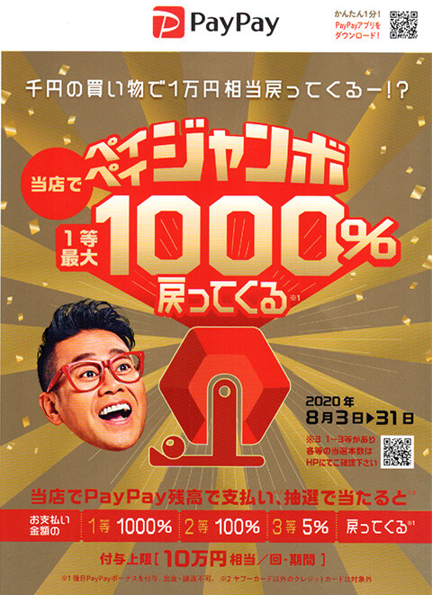 PayPay残高で支払い、抽選で1等が当たると、決済金額の10倍が戻ってくるのですって!