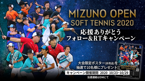 感謝の応援ありがとうフォロー&RTキャンペーン開催🎉@MIZUNO_S_TENNIS フォロー+この投稿RTで大会限定ポスタープレゼント🎶#ミズノ#ソフトテニス#ミズノソフトテニス#ミズノオープンソフトテニス #MOS2020 pic.twitter.com/BdRYcOUDL8