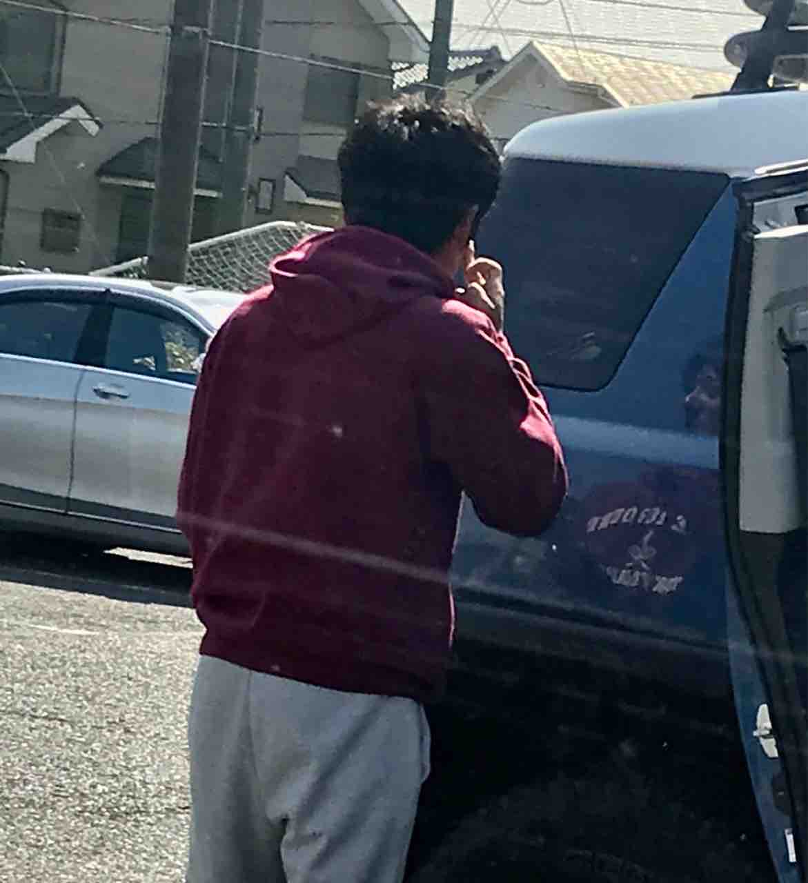 車のガラスを鏡にし日焼け止めを塗っていたところを、激写されてました。