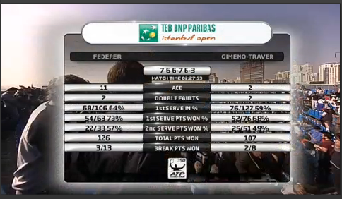 ストロークはギメノトレイバーの方がよかった。しかもいいところ振り切ってウィナーを取ってました。想像以上にいいプレーヤーだとも思いました。ドロップもいいところ落とす。。。そんな中で1stセットは本当によく取れたと思いました。フェデラーはサーブはふつうぐらいの出来がありました。クレーなのでエース量産という感じにはならないのですが、これでなんとか凌いだ感じでした。ネットプレーやドロップでなんとかポイントを重ねるという感じでした。