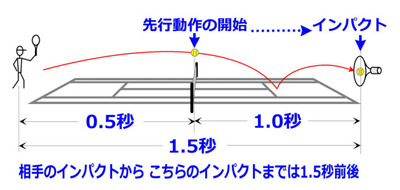 そして、「相手が打ってからこちらが打つまでの時間」がトータルで1.5秒だとすれば、差し引きすると、相手が打ってから0.5秒くらいで、そのボールを打ち返すための先行動作をスタートさせなければ間に合わないわけですが、その時点は相手が打った直後であり、打たれたボールがネットを越えるか越えないかというタイミングです。