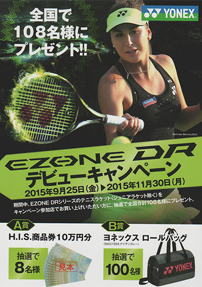 【内容】期間中、キャンペーン参加店にてEZONE DRシリーズのテニスラケット(ジュニアラケット除く)をお買い上げいただい方に、以下の賞品を抽選でプレゼントします。