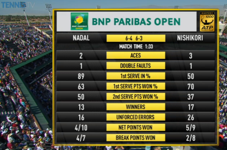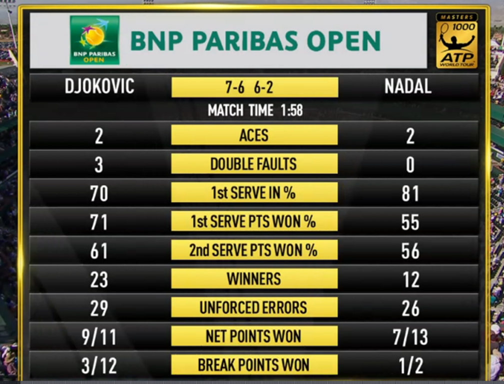 しかしジョコビッチはフォアハンドでもバックハンドでも肩口の高い打点からフラットに近い感じで打ち抜く技術はすごいものがあります。ナダルのスピンが効いた深いボール、インディアンウェルズの弾むコートも全く関係なし。。。