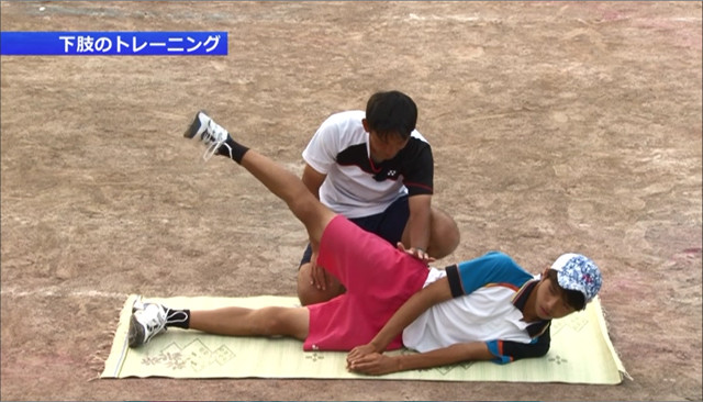さらに上の画像のようなトレーニングを行うことで線の細い体格の学生世代にも内側の強靭な筋肉から伝わるパワーで強力な打球が可能になります。