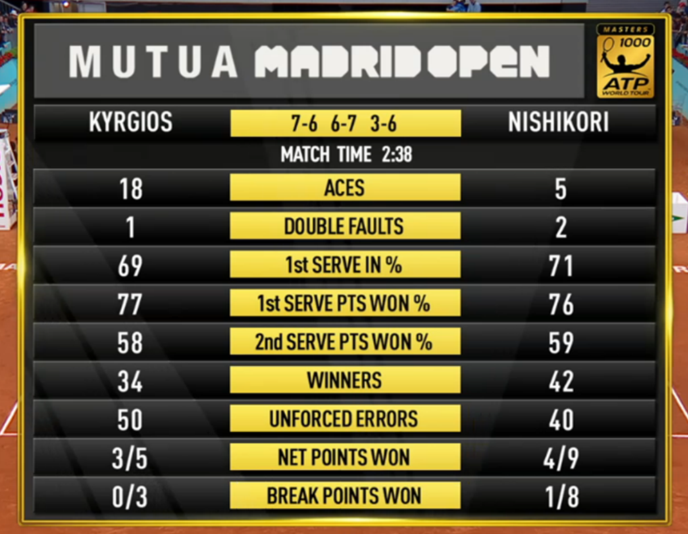 もうすこし詳しく振り返りますが、この試合は何といってもキリオスのサーブが素晴らしかった。屋根が閉まってインドアになったこともありますが、クレーとは思えない試合展開でキリオスはセンターへのフラットサーブを軸にボコボコとエース、フリーポイントを量産していきます。錦織はリターン力があるのは、誰もが知っていることですが、1.2setはまったくのお手上げ状態でした。さらに1stセットの4-5 5-6でセットのかかる場面でもキリオスはサービスゲームまったく動じず、すごいサーブを打ってきてラブゲームキープ。特に5-6のキリオスのサービスゲームはジャンプしてのバックハンドドロップショットに、股抜きロブを決められる。この場面でさすがのメンタリティ。。。