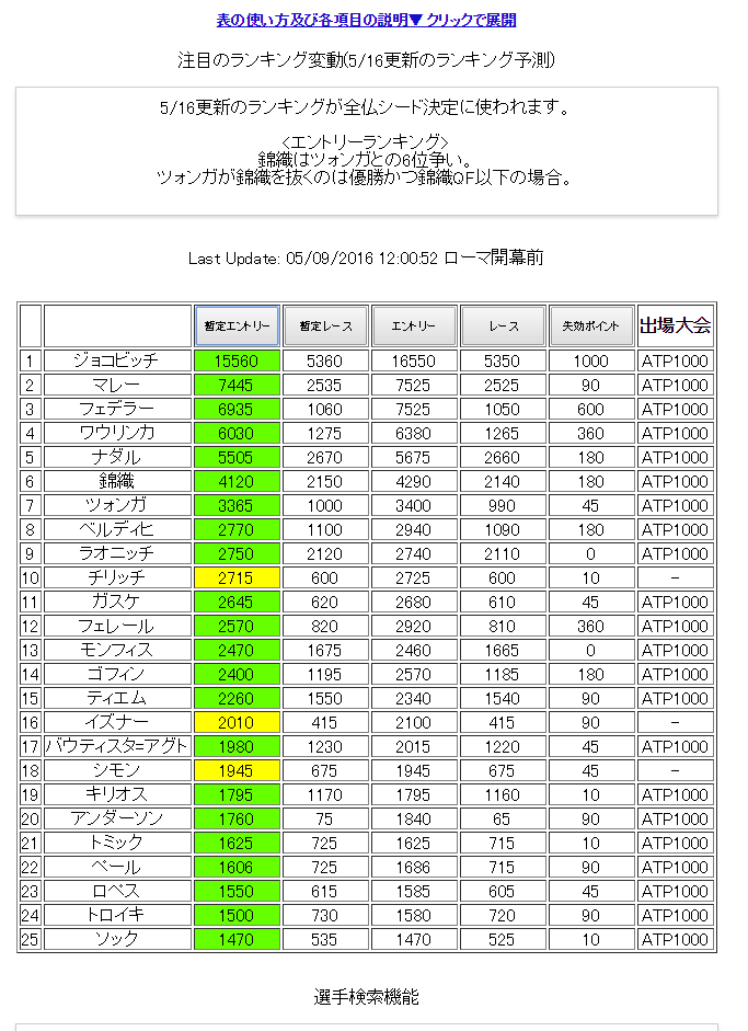 全仏のシードはローマ終了後のランキング(5/16付ランキング)を基に決められます。