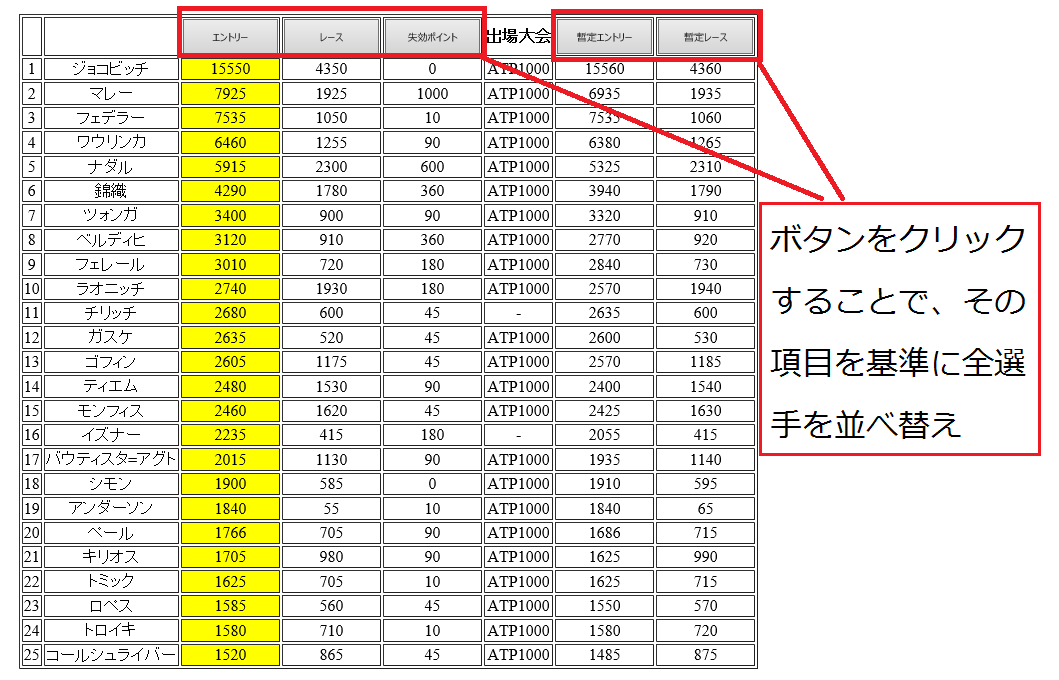 これまで「ATPランキング マルチチャート」という名称でやってきましたが、「チャート」というのは本来、図やグラフに対して使うもので、単純な表については「テーブル」が一般的なようです。