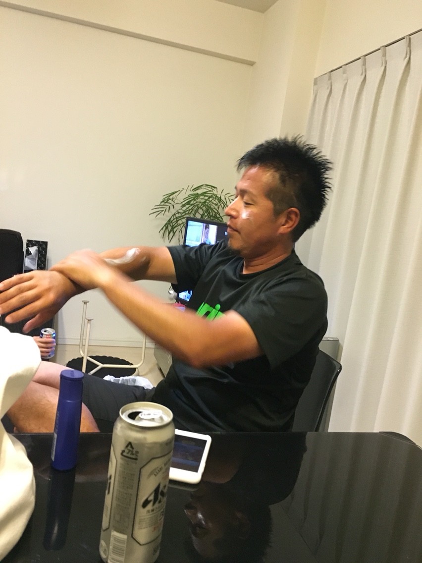 はい、風呂上がりにクリームを塗る野口です。