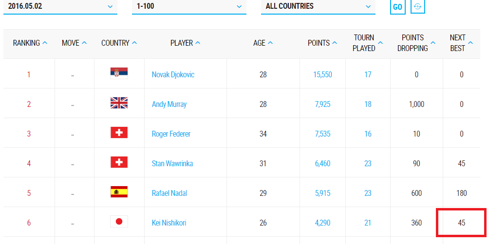 赤枠で囲った「45」が錦織のNEXT BESTです。