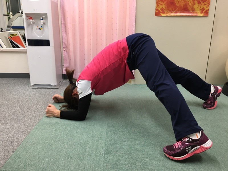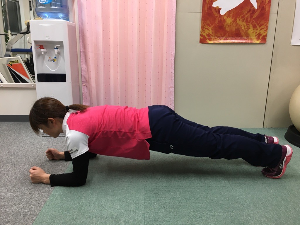 うつ伏せになり、両肘を肩の下につき、つま先を立てて身体を持ち上げます。