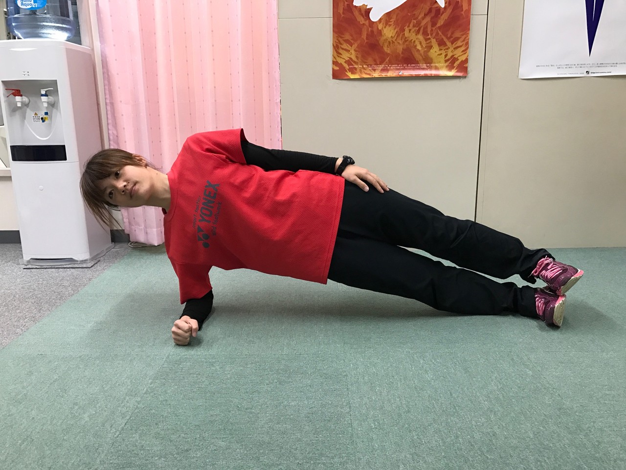 横向きになり、下側の肘を肩の下につき、上体をあげます。
