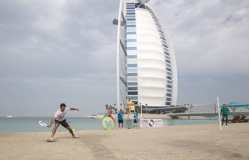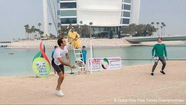ドバイ選手権のプロモーションとして、フェデラーとマレーがブルジュアアルアラブの前でビーチテニスをしています!ドバイは25周年記念になります。