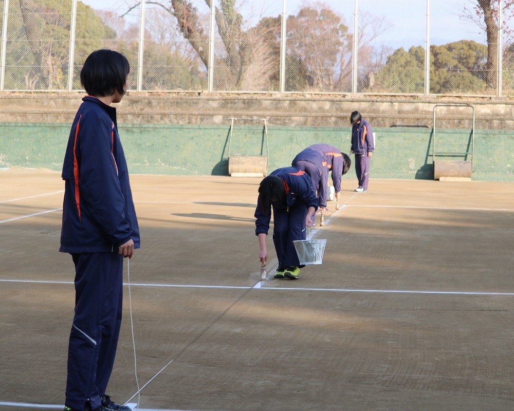よく見ると、長い紐を2人の生徒が持ち、その紐の横にバケツを持った生徒が線を描いています…!生徒全員が慣れた手つきで進めること約20分。完成したのは、、、練習するために不可欠なテニスコート!バケツの中には液体状の石灰が入っていたんですね☆
