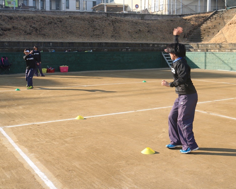 ウォーミングアップが終了し、いよいよ本格的な練習スタート?と思いきや、、、生徒はラケットではなく、カラーマーカーをコートに設置し、2人1組で素振りを始めました。(ラケット持たずに素振り...?)