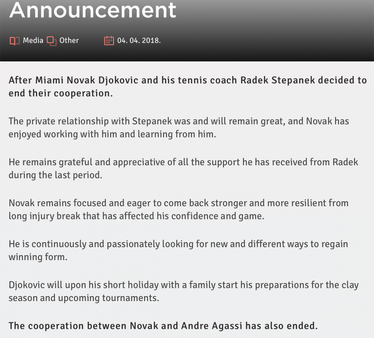 大きくニュースでとりあげられているので、ご存知の方も多いと思いますが、ジョコビッチはステパネクとアガシと契約解消となりました。