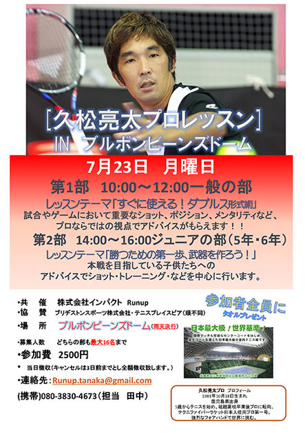 7月23日(月曜日)に、ブルボンビーンズドームにて、久松亮太プロのテニスクリニックが行われます。