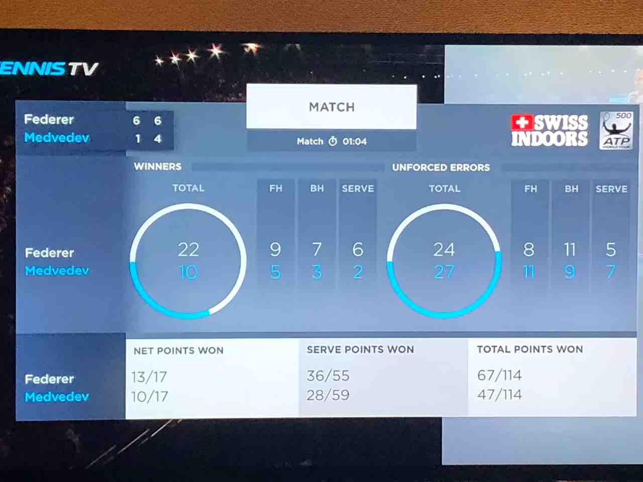 フェデラーは「自分にとって非常に良い勝利だった。点数をつけるなら10点満点中8点。上海で対戦したときはタフな試合だった。いくつかミスのあった終盤を除けば、全体に感触は良かった。彼は昨晩遅くに試合が終わったから、もしかしたら脚が重かったのかもしれない。きょうは経験をうまく生かせた」