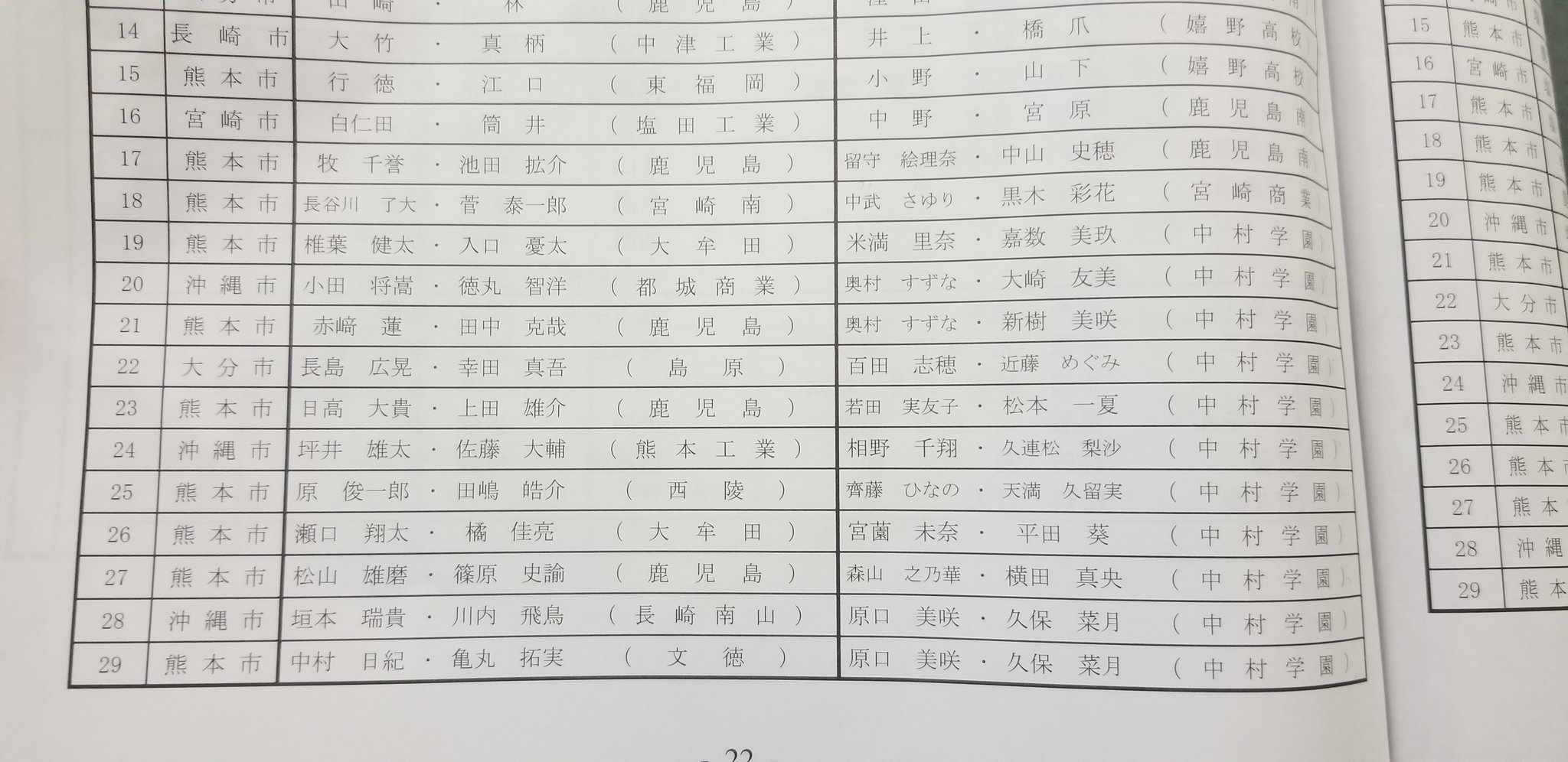 五位 平野・西(鹿児島:鹿児島南)/川野・羽田(福岡:中村学園)/永江・藤沢(福岡:中村学園)/原・能見(佐賀:佐賀清和)