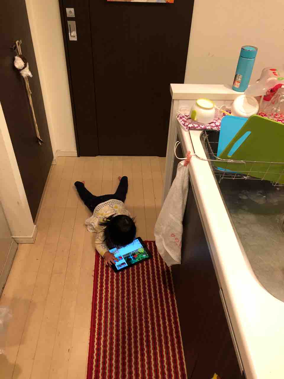 昨夜ご飯作ってるとき、キッチンで横になりiPadでYouTubeを見るさくら。