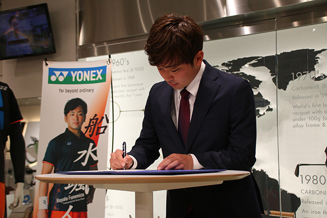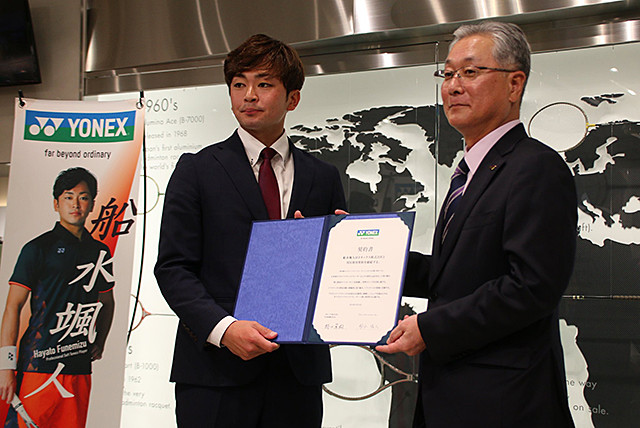 林田草樹社長との固い握手を交わし YONEXとの所属を含む用具使用契約を締結しました! 続きを読む