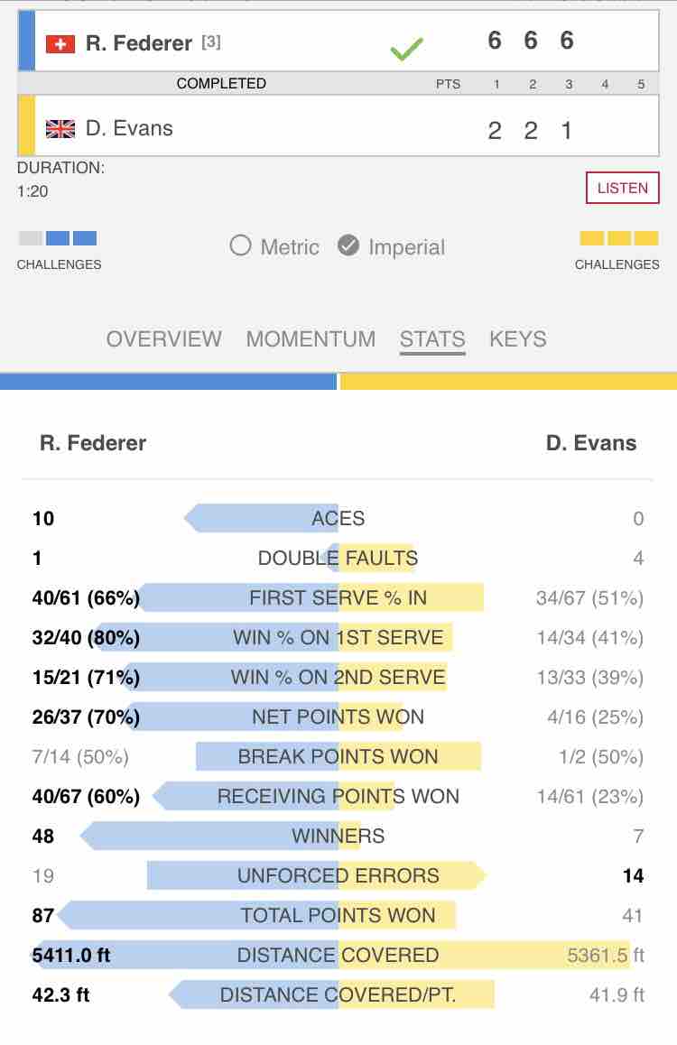 1.2回戦立ち上がりがうまくいかなかったフェデラーですが、3回戦はスタートからスムーズに運びエバンズを圧倒しました。