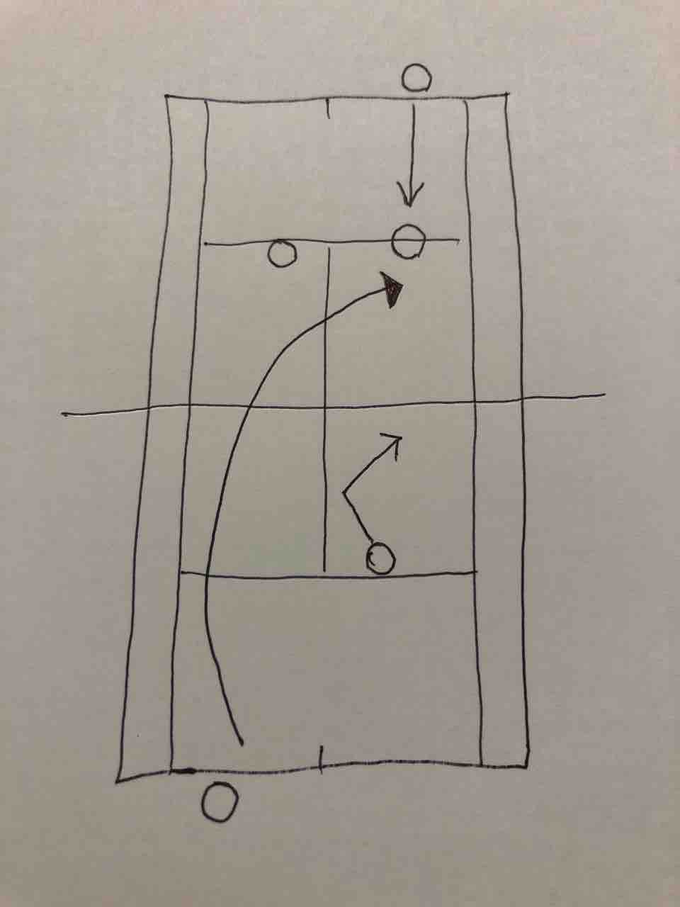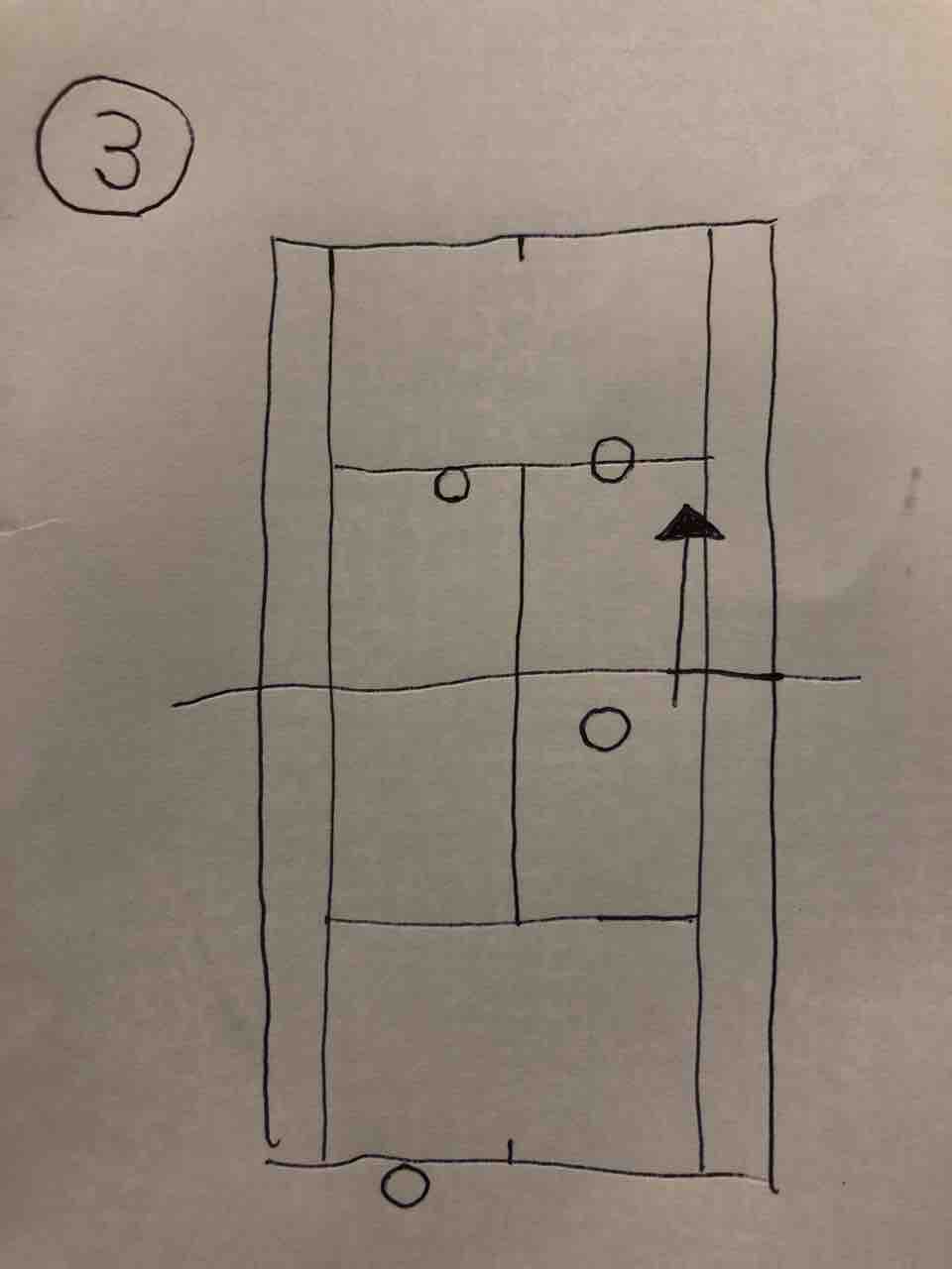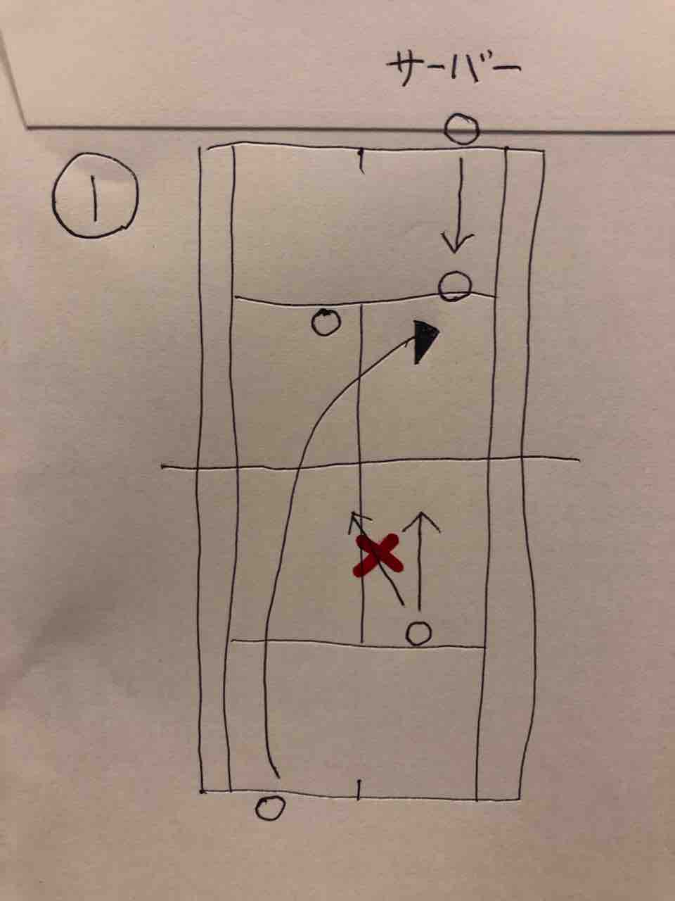 ①で赤い×を書いてますが、クロスに動くとクロスに飛んでくるファーストボレーに対しポーチができます。