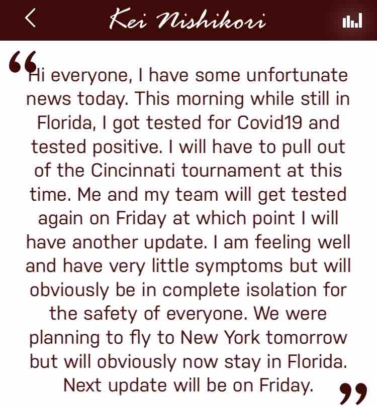 錦織「みなさま、こんにちは。今日は残念なニュースがあります。今朝、まだフロリダにいる間にコロナの検査をしたところ、陽性反応がありました。私はそのためシンシナティを欠場せざるをえなくなりました。私と私のチームは金曜日にもう一度テストを受けて、アップデートします。私は体調良くて、症状はほとんどありませんが、私はみんなの安全のため完全に隔離しています。私たちはNYへ明日へ飛ぶ予定でしたが、今はフロリダにいます。また、金曜日に更新します。」